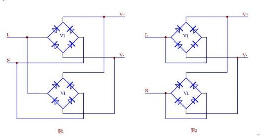 1、整流橋并聯(lián) 在小功率設(shè)計中,一般很少用到整流橋的并聯(lián),但在某些大功率輸出的情況下,不想增添新的器件單個整流橋電流又不滿足輸入功率要求,就需要用到整流橋的并聯(lián)了,整流橋的并聯(lián)不能采用兩個整流橋各自整流后直流并聯(lián)的方式,也就是不能采用圖1的方式,因為整流橋沒有配對,單純靠自身的V-I特性,一般是無法均流的,這樣就會造成兩個整流橋發(fā)熱不一致。而采用圖2的方式,通常認為在一個封裝內(nèi)的兩個二極管是非常匹配的,是可以均分電流的,所以采用圖2的方式就可以實現(xiàn)整流橋的并聯(lián)了。